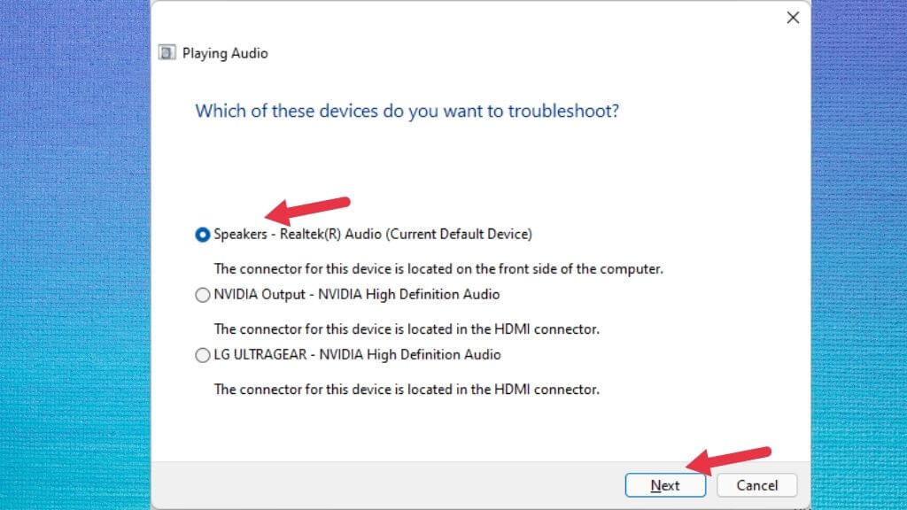 ここから、チェックするオーディオ デバイスを選択し、トラブルシューティング ツールを実行させます。
