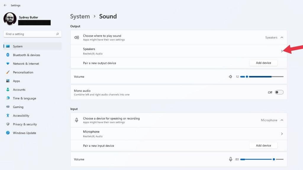 オーディオ デバイスを無効にして、Windows で検出されないようにするには、そのデバイスの横にある右向きの矢印を選択します。 サウンドを再生する場所を選択する。 次に、 許可しない の隣に アプリと Windows がこのデバイスをオーディオに使用することを許可します。