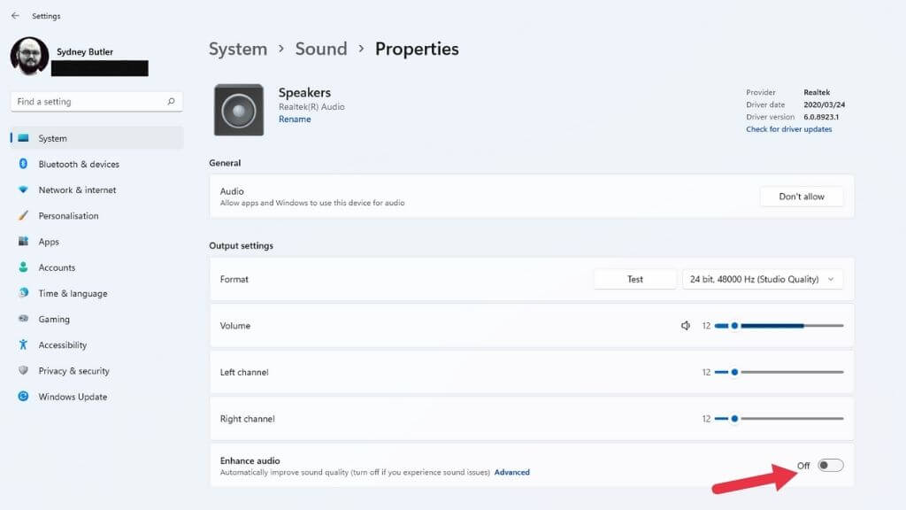 一部のオーディオデバイスで問題が発生する可能性があるため、この機能はデフォルトで無効になっています。誰かが知らないうちに「サウンド拡張」を有効にしている可能性がありますので、この機能がオフになっていることを確認してください。
